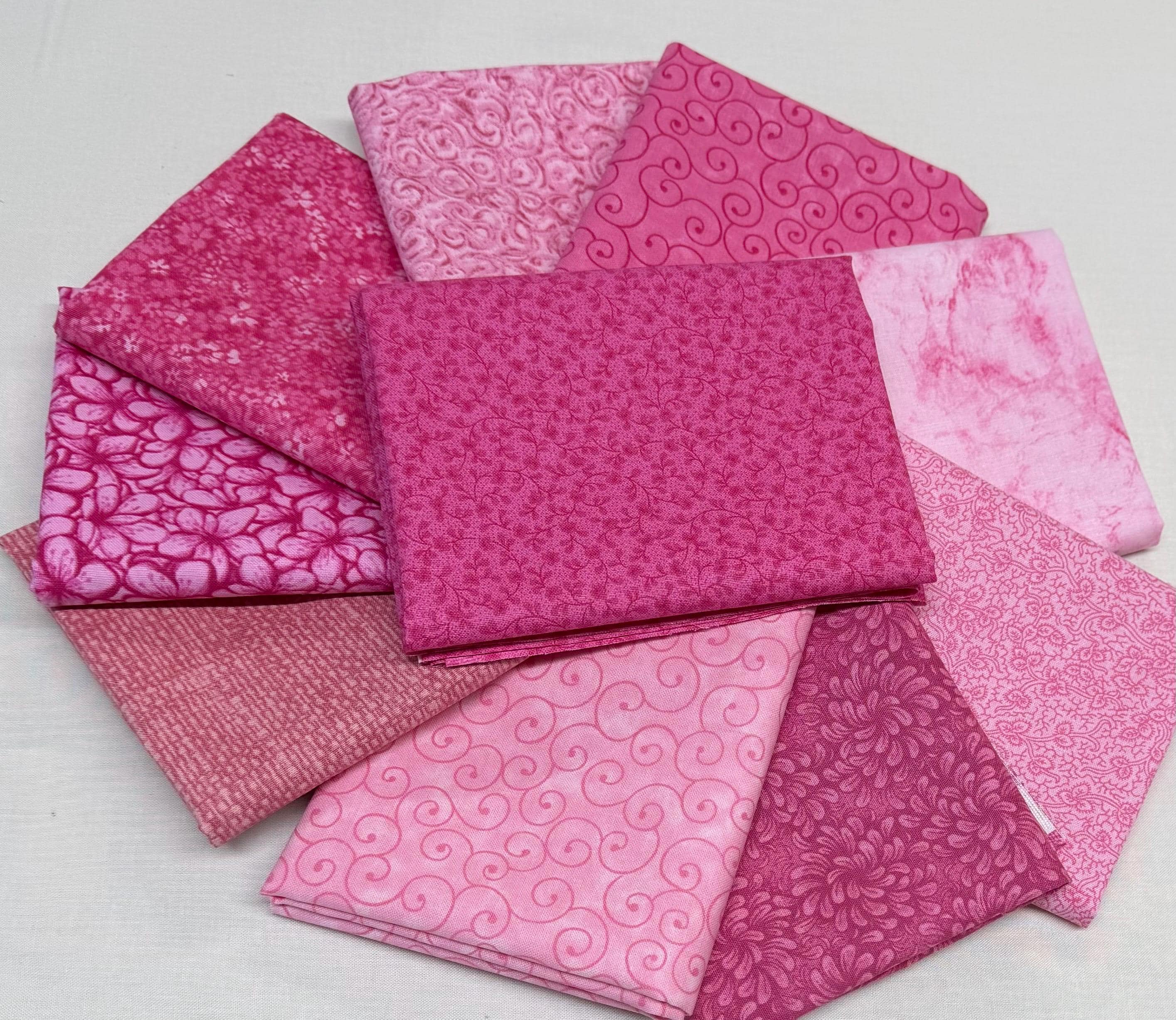 10 hand cut fat quarters in coordinating shades of Pink prints . 18 x 21. Prints may vary from pictures due to availability.