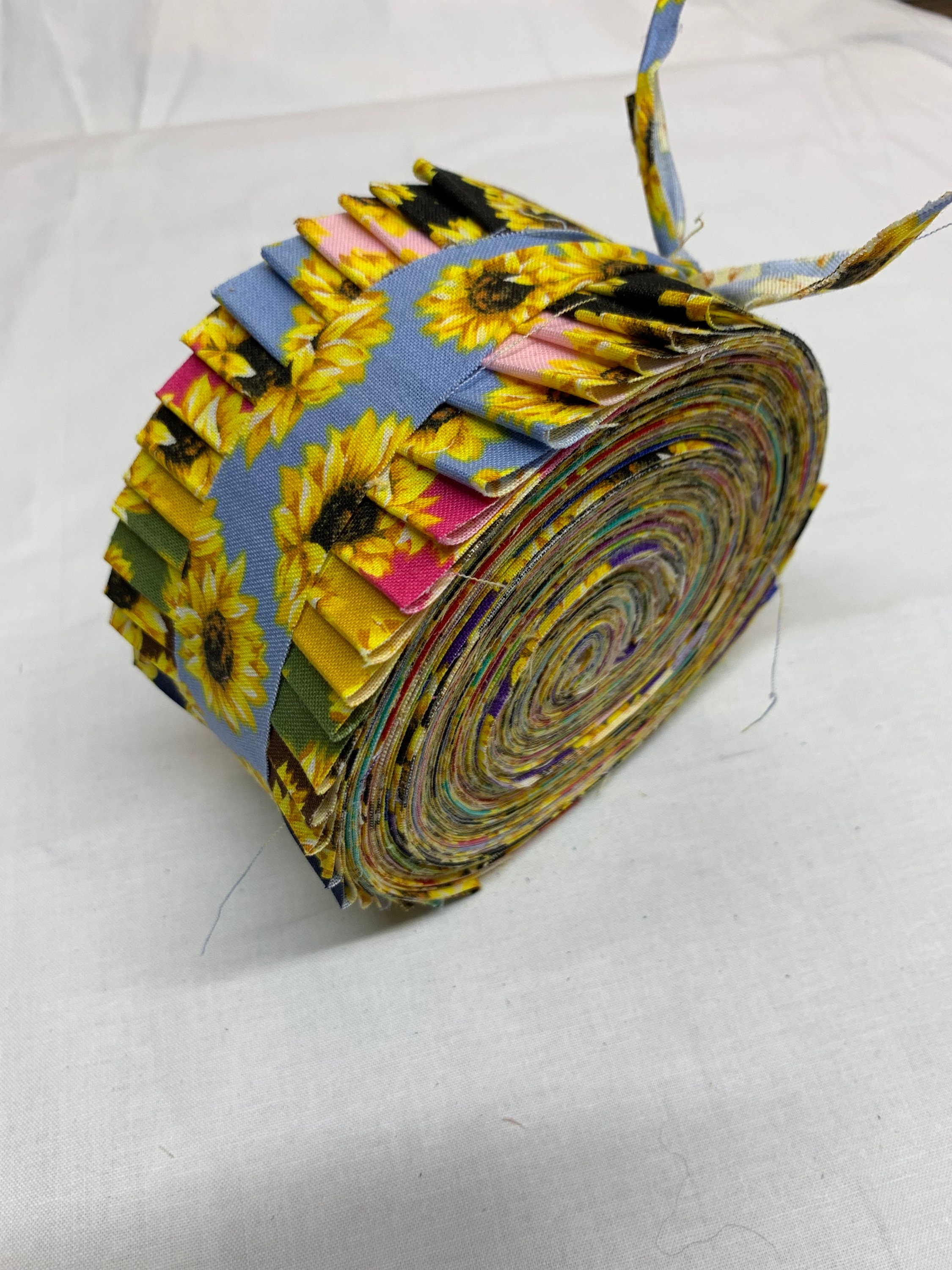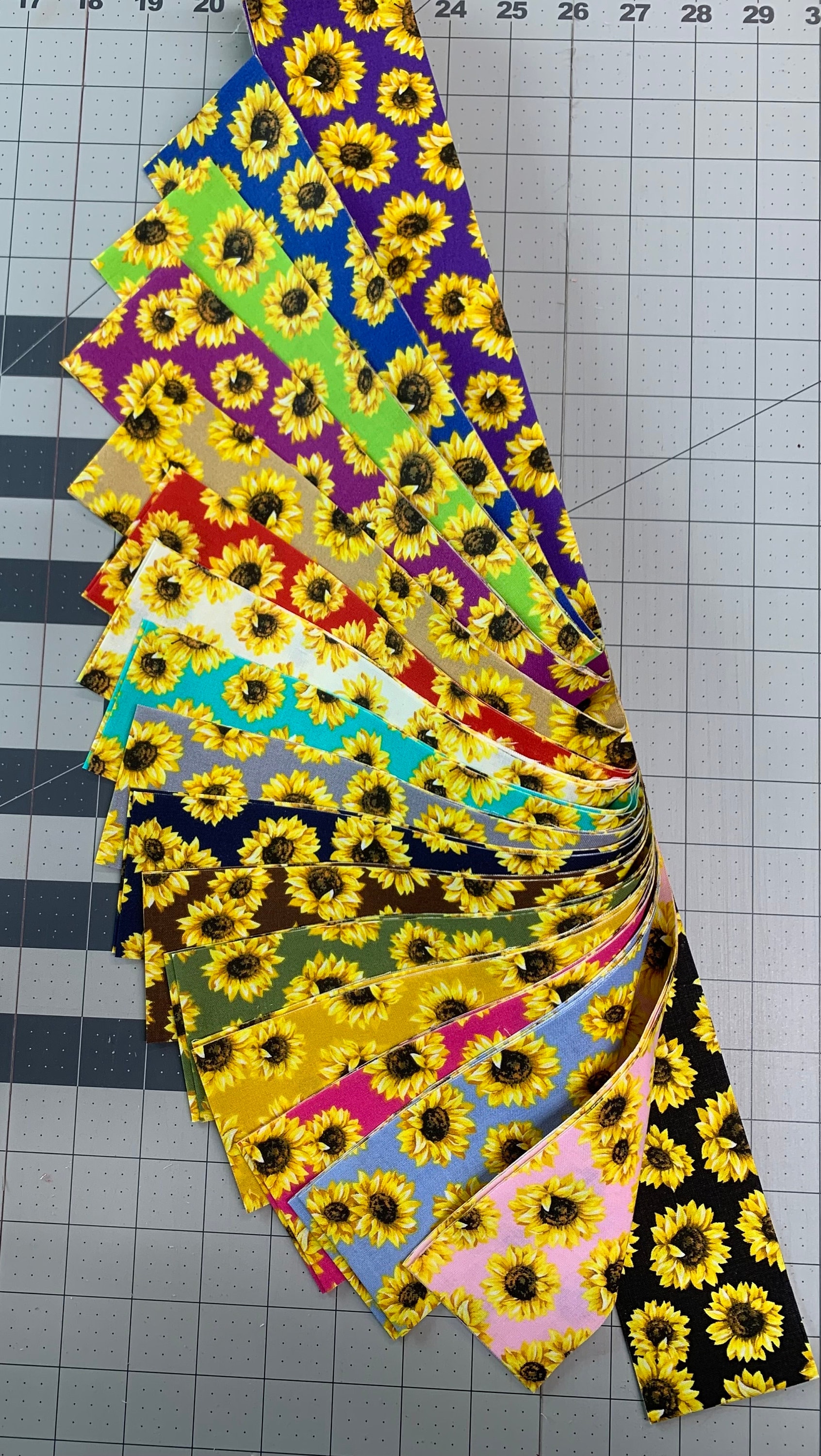 34 strips. 17 colors with 2 of each color . 2.5 x 44 strips. 100% cotton