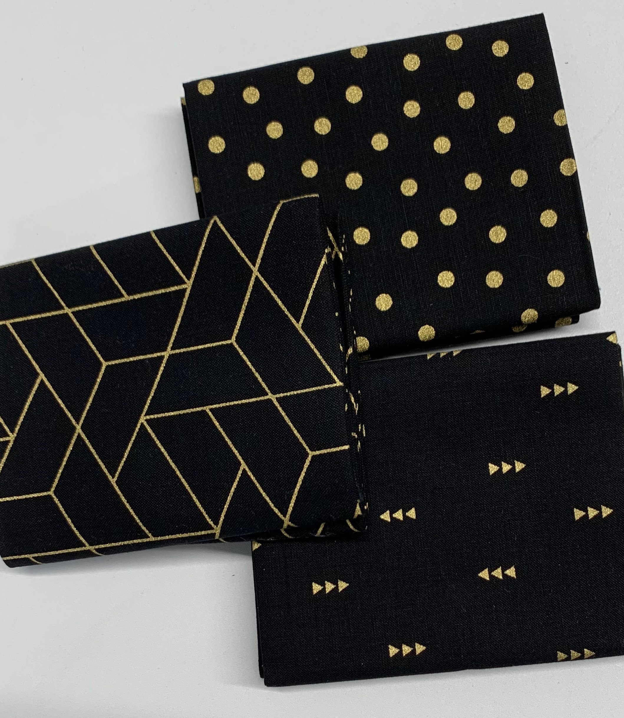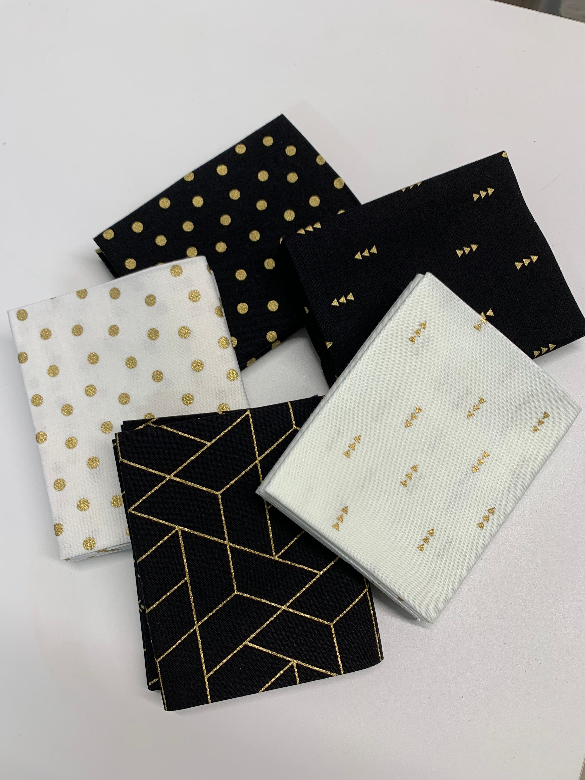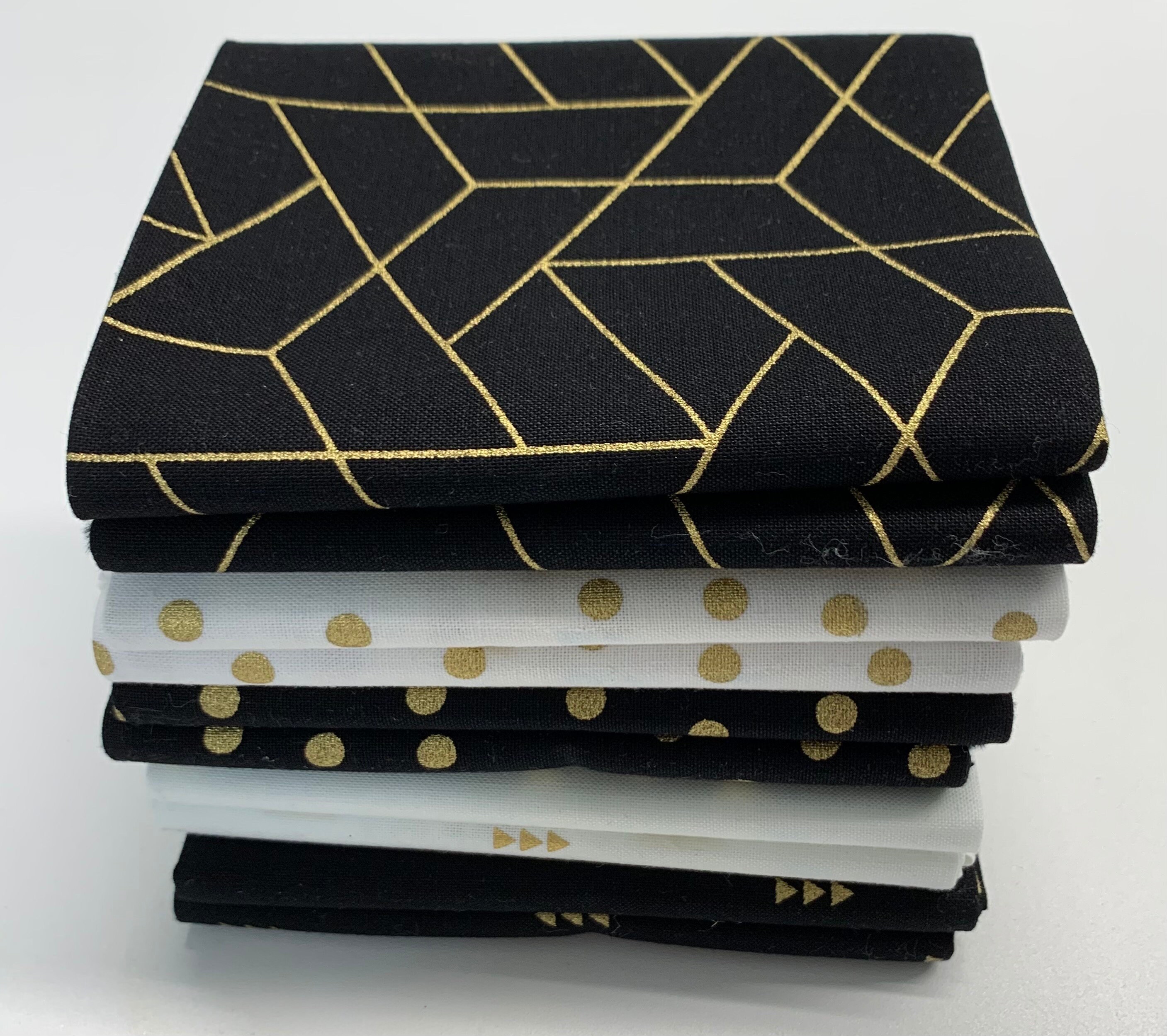 Black/White Gold Accents by Mixology for Camelot fabrics. 10 fat quarters-2 of each color design. 18x22. 100% cotton. Quilt Shop Quality
