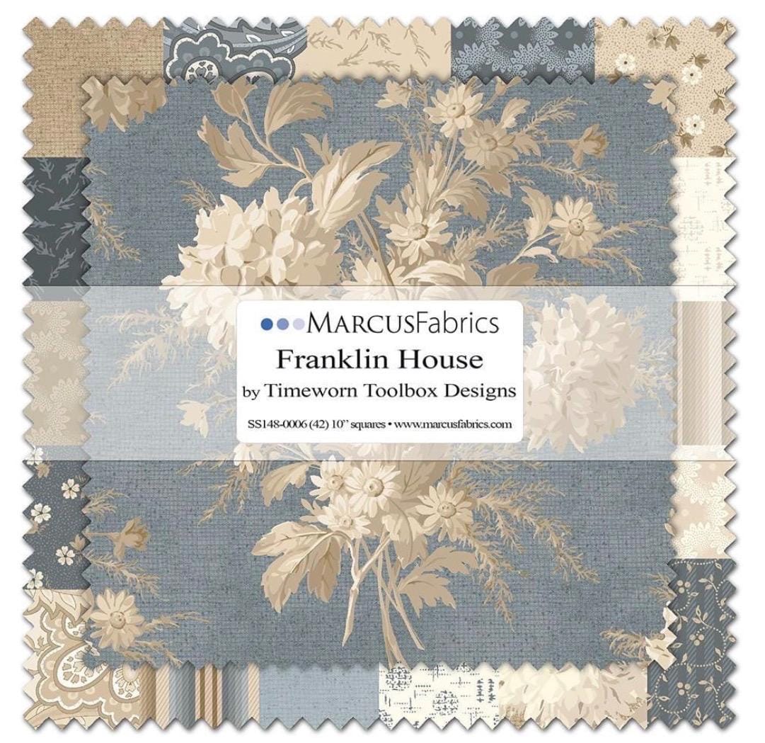 Beautiful Blues-Creams-Tans by Timeworn Toolbox Designs for Marcus fabrics. 100% cotton. 10" squares. 42pc