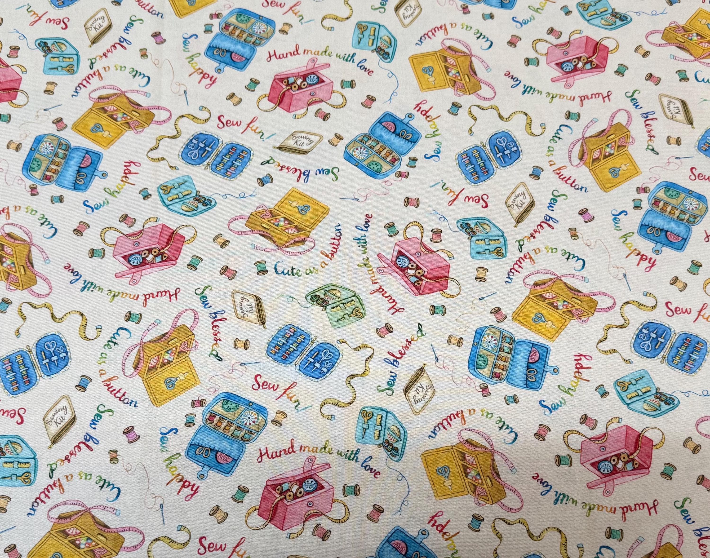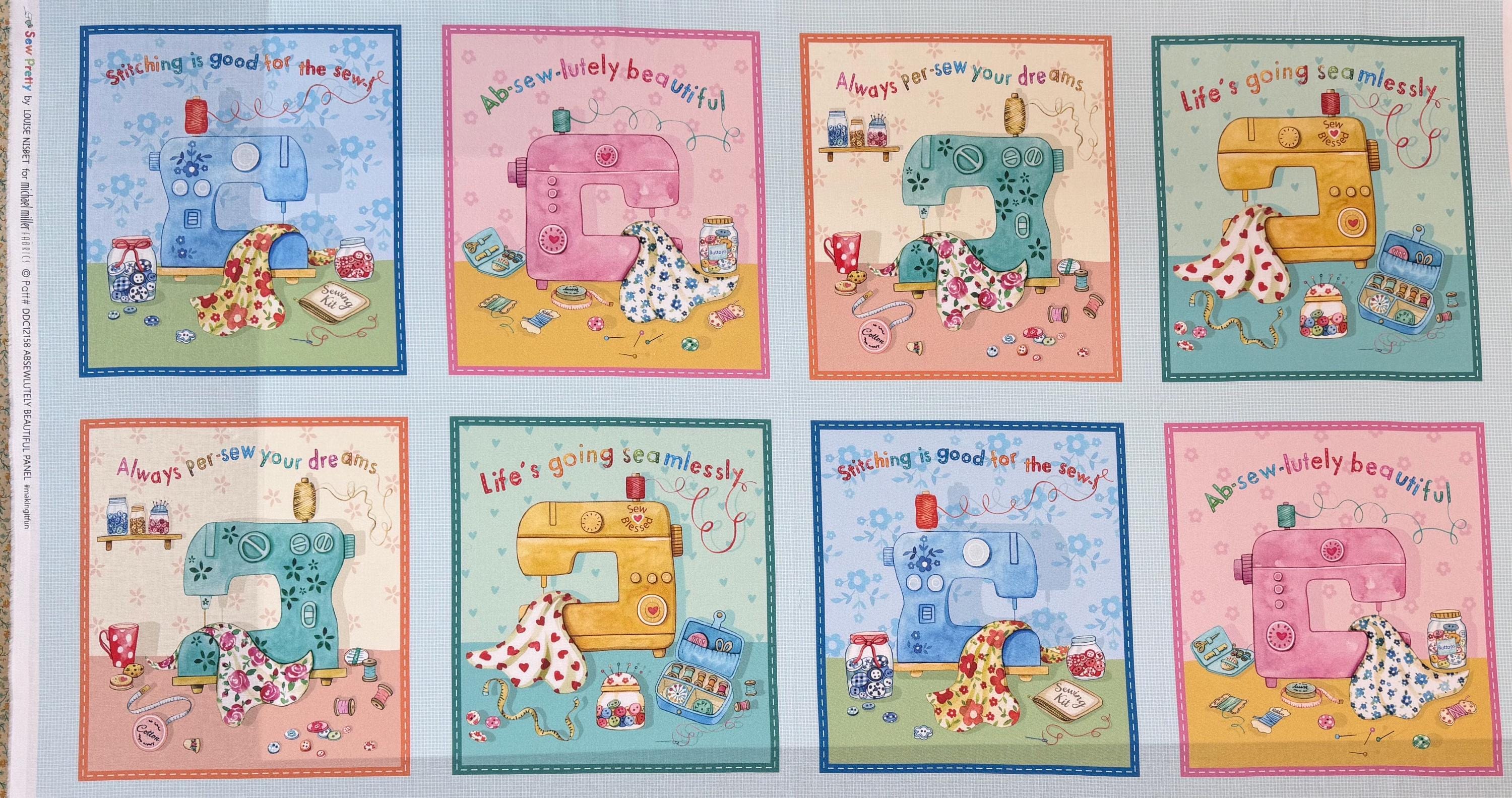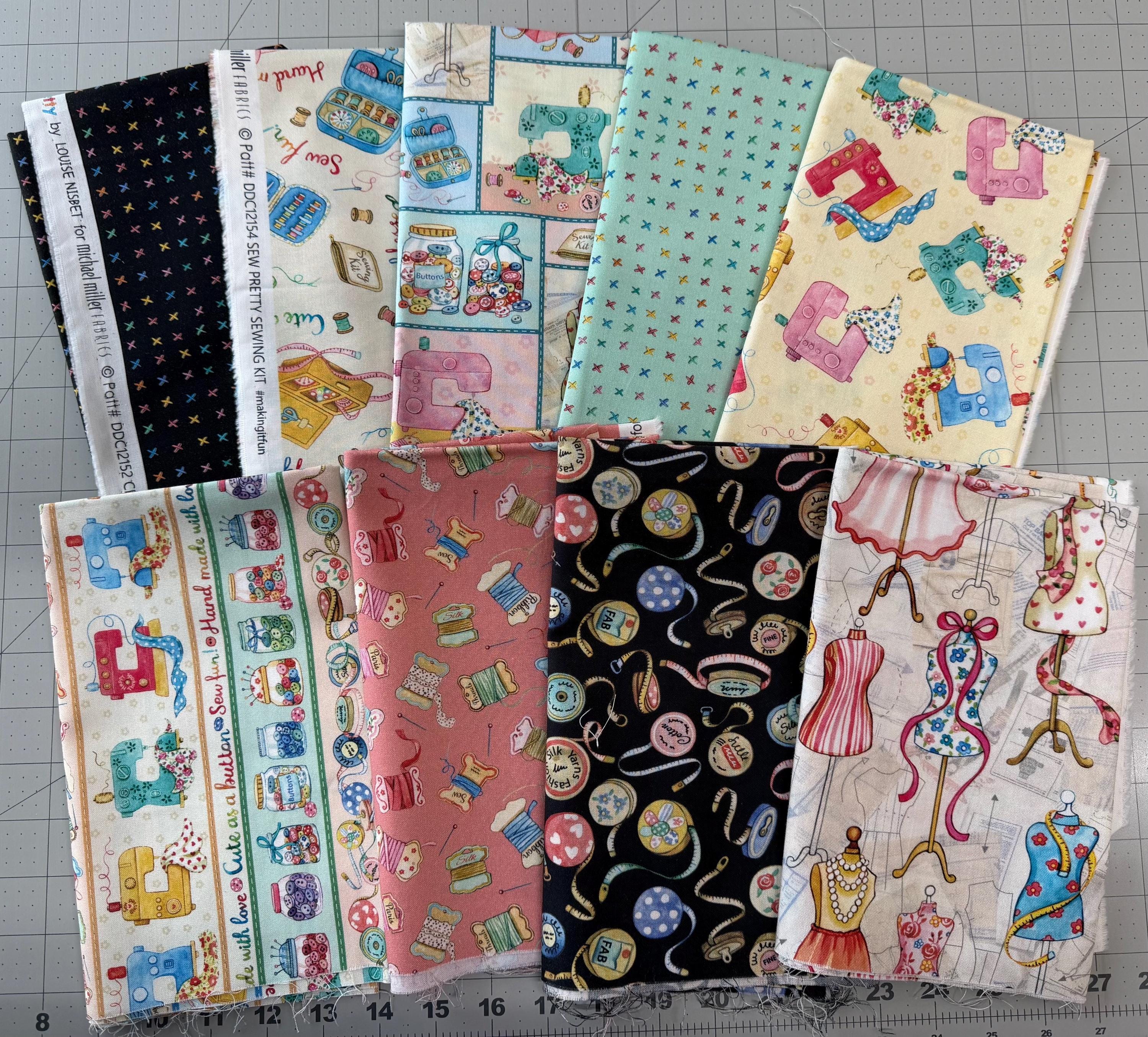 Sew Pretty!! These are the cutest sewing & notion prints!! This is a 1/2 yard bundle with the Pillow Panel. This is the ENTIRE line you are getting! 18 half yard pieces and the Panel! Design by Louise Nisbet for Michael Miller fabrics. 100% cotton. half yards are 18" by 44"--Panel is 24" by 44".